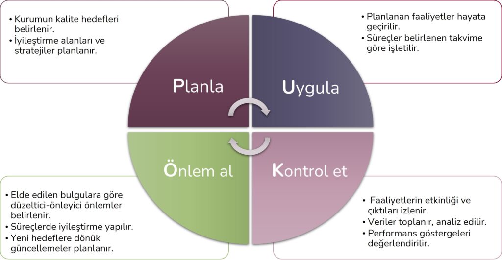 Üniversitede kalite yönetimi süreçleri Planla – Uygula – Kontrol Et – Önlem Al (PUKÖ) döngüsü temelinde yürütülmektedir. Bu döngü sayesinde kurumsal faaliyetler düzenli olarak gözden geçirilmekte, değerlendirme sonuçları doğrultusunda geliştirme ve iyileştirme faaliyetleri planlanarak uygulamaya alınmaktadır.